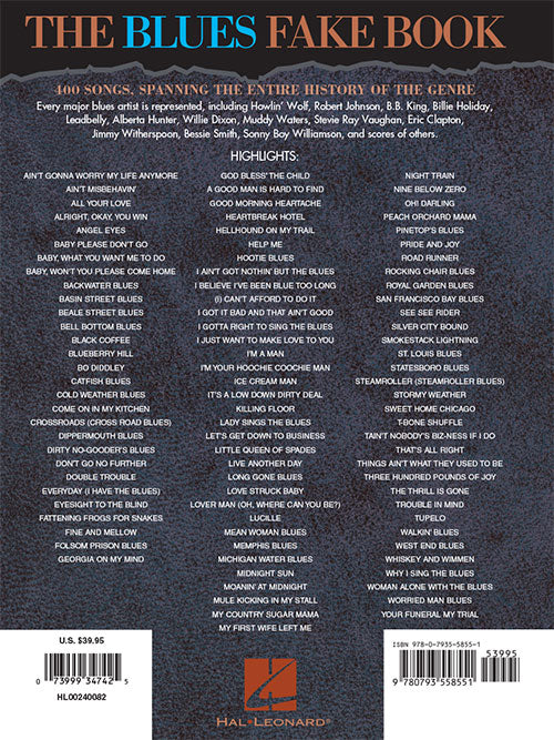 The most comprehensive single-volume blues publication ever, with songs spanning the entire history of the genre. Every major blues artist is well-represented, including Howlin' Wolf, Robert Johnson, B.B. King, Billie Holiday, Leadbelly, Alberta Hunter, Willie Dixon, Muddy Waters, Stevie Ray Vaughan, Eric Clapton, Jimmy Witherspoon, Bessie Smith, Sonny Boy Williamson, and scores of others. Features very easy-to-read engravings of 400 fantastic songs, including: All Your Love (I Miss Loving) · Angel Eyes · Baby Please Don't Go · Basin Street Blues · Beale Street Blues · Bell Bottom Blues · Black Coffee · Crossroads · Do You Know What It Means to Miss New Orleans · Everyday (I Have the Blues) · Fine and Mellow · Folsom Prison Blues · A Good Man Is Hard to Find · Hellhound on My Trail · (I) Can't Afford to Do It · I Gotta Right to Sing the Blues · Ice Cream Man · Lady Sings the Blues · Lover Man (Oh, Where Can You Be?) · Lucille · Mean Woman Blues · My First Wife Left Me · Nine Below Zero · Oh! Darling · Road Runner · Royal Garden Blues · St. Louis Blues · Steamroller Blues · Stormy Weather · Sweet Home Chicago · Tain't Nobody's Biz-ness If I Do · The Thrill Is Gone · Worried Man Blues · hundreds more!