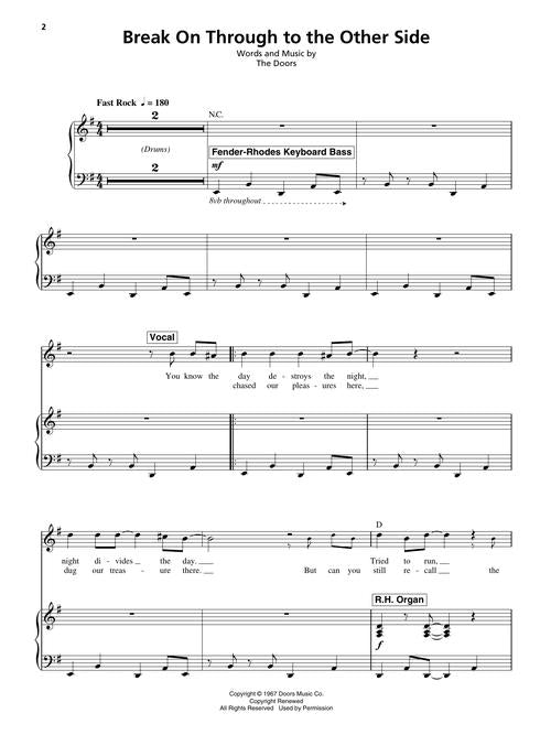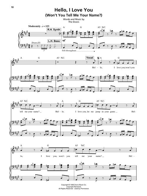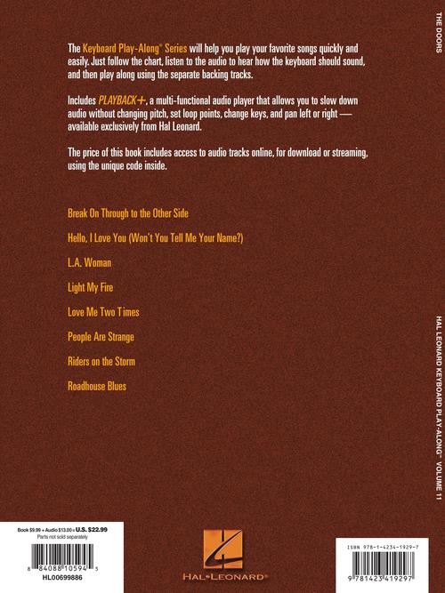 The Keyboard Play-Along Series will help you play your favorite songs as played by your favorite artists quickly and easily. Just follow the music in the book, listen to the audio to hear how the keyboard should sound, and then play along using the separate backing tracks. The melody and lyrics are also included in the book in case you want to sing, or to simply help you follow along. This volume contains 8 songs: Break on Through to the Other Side · Hello, I Love You (Won't You Tell Me Your Name?) · L.A. Woman · Light My Fire · Love Me Two Times · People Are Strange · Riders on the Storm · Roadhouse Blues. Audio is accessed online using the unique code inside the book and can be streamed or downloaded. The audio files include PLAYBACK+, a multi-functional audio player that allows you to slow down audio without changing pitch, set loop points, change keys, and pan left or right.