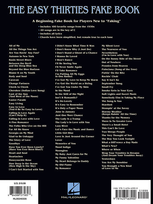 100 beloved songs from the 1930s, all in the key of C, with melody, lyrics and simplified chords in large notation. Includes: All of Me · Blame It on My Youth · Body and Soul · Easter Parade · The Glory of Love · I Wanna Be Loved · It's De-Lovely · The Lady Is a Tramp · Lazy River · The Nearness of You · Mood Indigo · Stardust · The Very Thought of You · What's New? · Where or When · and many more.