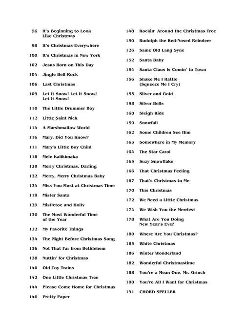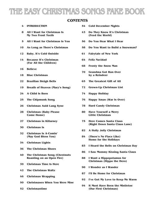 100 contemporary holiday hits in the popular Easy Fake Book format are presented in this book featuring large, easy-to-read notation, simplified harmonies and melodies, lyrics, and easy stay-open binding, all in the key of C. Songs include: All I Want for Christmas Is You · Breath of Heaven (Mary's Song) · The Christmas Song (Chestnuts Roasting on an Open Fire) · Do You Want to Build a Snowman? · Frosty the Snow Man · Grown-Up Christmas List · Happy Xmas (War Is Over) · It's Beginning to Look like Christmas · Jingle Bell Rock · Let It Snow! Let It Snow! Let It Snow! · Mary, Did You Know? · Please Come Home for Christmas · Rudolph the Red-Nosed Reindeer · Silver Bells · White Christmas · You're a Mean One, Mr. Grinch · and more.