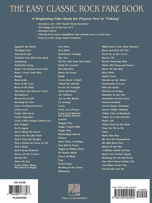 Here are 101 great classic rock songs that are easy to learn and play. All are in large notation and in the key of C, with lyrics and simplified chords that remain true to each tune. Includes: Against the Wind · Another One Bites the Dust · Barracuda · Born to Be Wild · Carry On Wayward Son · Cold as Ice · Come Sail Away · Crazy Little Thing Called Love · Don't Stand So Close to Me · Don't Stop Believin' · Dream On · Free Bird · Free Ride · Heartache Tonight · Hot Blooded · In the Air Tonight · Layla · Livin' on a Prayer · Maggie May · Proud Mary · Rhiannon · Rock and Roll All Nite · Smoke on the Water · Sultans of Swing · Sweet Home Alabama · Tush · Walk This Way · We Will Rock You · and more.