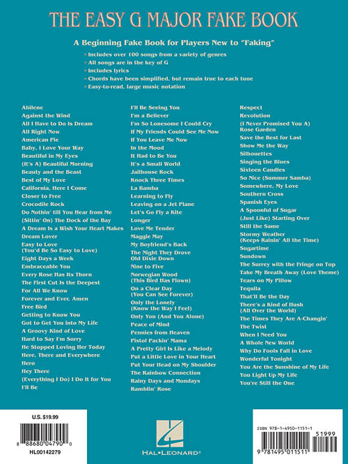Perfect for beginning players new to faking, this collection features over 100 songs all in the key of G. With easy-to-read, large music notation, the chords have been simplified, but remain true to each tune. Songs include: All I Have to Do Is Dream · Best of My Love · Crocodile Rock · Eight Days a Week · The First Cut Is the Deepest · A Groovy Kind of Love · He Stopped Loving Her Today · I'll Be Seeing You · In the Mood · It Had to Be You · Jailhouse Rock · Leaving on a Jet Plane · Maggie May · Nine to Five · Peace of Mind · The Rainbow Connection · Revolution · Sixteen Candles · Sundown · That'll Be the Day · When I Need You · and many more.