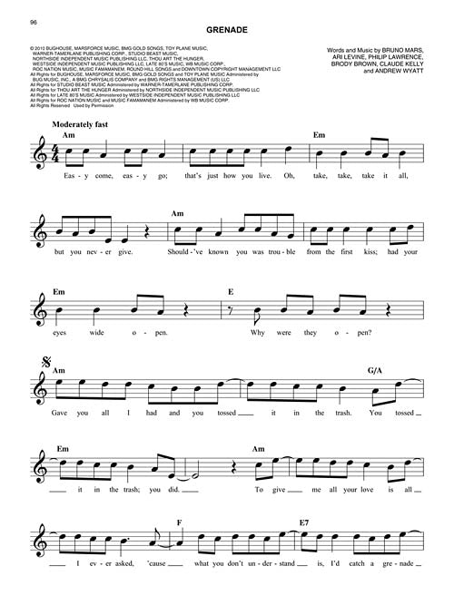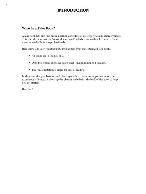 Here are 100 top pop/rock songs that are easy to learn and play. All are in large notation and in the key of C, with lyrics and simplified chords that remain true to each tune. Includes: All Right Now · Billie Jean · Carry on Wayward Son · Change the World · Dancing Queen · Don't Fear the Reaper · Don't Worry, Be Happy · Eye of the Tiger · Fireflies · The Greatest Love of All · Hey, Soul Sister · How to Save a Life · How You Remind Me · I Want to Hold Your Hand · Kiss on My List · Like a Prayer · Love Shack · Mony, Mony · Oh, Pretty Woman · Pour Some Sugar on Me · She Will Be Loved · Smooth · Sweet Dreams (Are Made of This) · Use Somebody · With or Without You · You Really Got Me · and more.