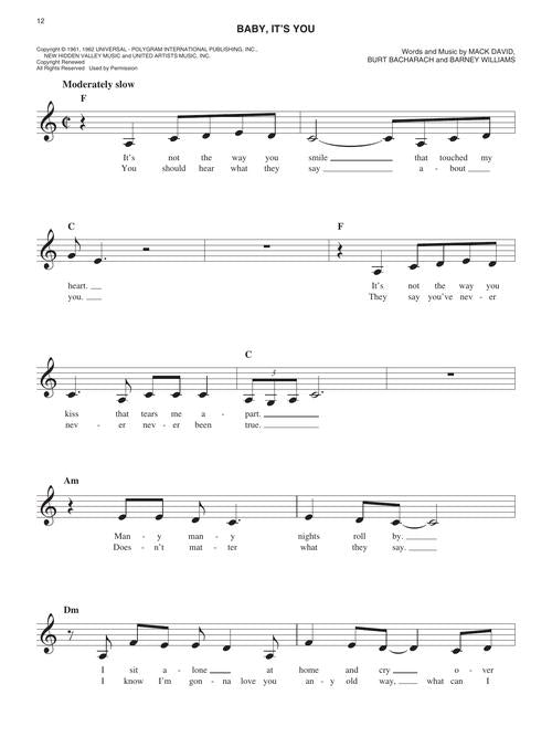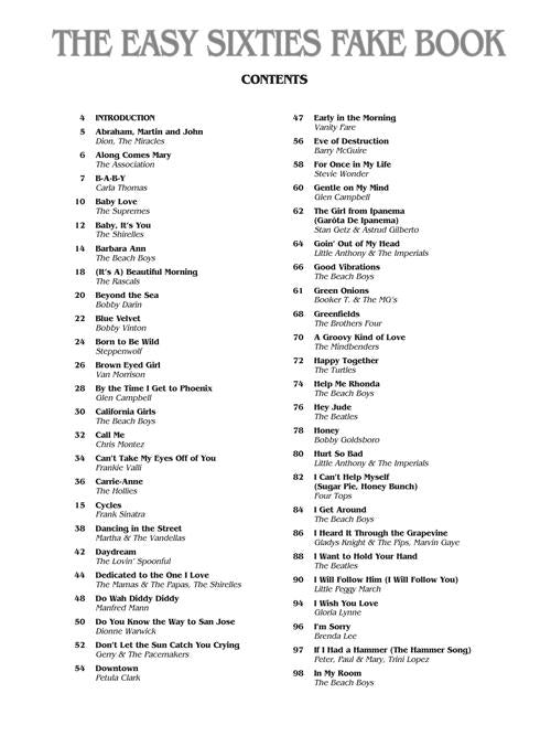 This series of beginning fake books for players new to faking includes: 100 memorable songs, all in the key of C · lyrics · chords which have been simplified, but remain true to each tune · easy-to-read, large music notation. 100 songs from the '60s: Baby Love · Dancing in the Street · The Girl from Ipanema · Good Vibrations · Hey Jude · I Heard It Through the Grapevine · Leaving on a Jet Plane · Respect · (Sittin' On) the Dock of the Bay · Soul Man · Turn! Turn! Turn! · and more.
