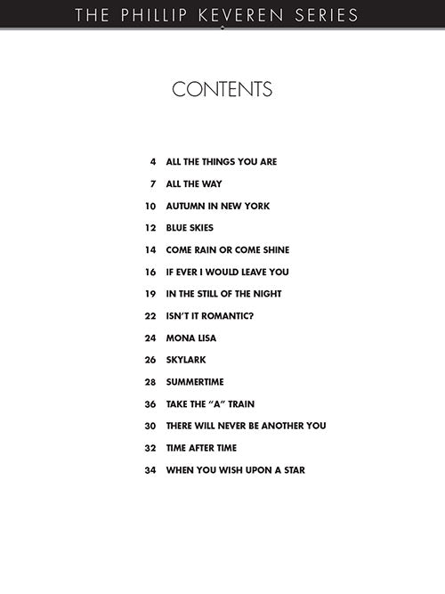 15 timeless classic standards as arranged for piano solo by Phillip Keveren: All the Things You Are · All the Way · Autumn in New York · Blue Skies · Come Rain or Come Shine · If Ever I Would Leave You · In the Still of the Night · Isn't It Romantic? · Mona Lisa · Skylark · Summertime · Take the A Train · There Will Never Be Another You · Time After Time · When You Wish upon a Star.