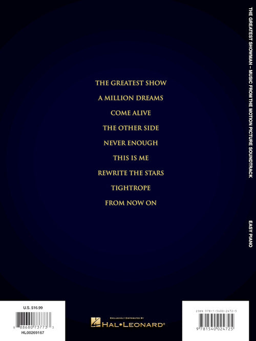 A musical drama biopic chronicling P.T. Barnum (played by Hugh Jackman) and his founding of the Barnum & Bailey Circus, this December 2017 film features a stunning soundtrack by Benj Pasek and Justin Paul of La La Land and Dear Evan Hansen fame. Our songbook features easy piano arrangements of 9 songs: Come Alive · From Now On · The Greatest Show · A Million Dreams · Never Enough · The Other Side · Rewrite the Stars · This Is Me · Tightrope.