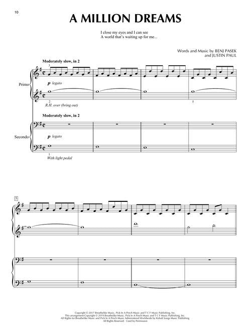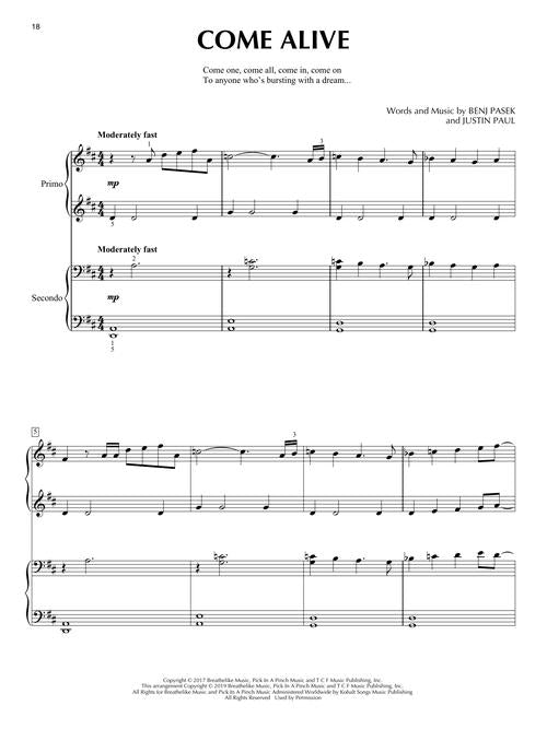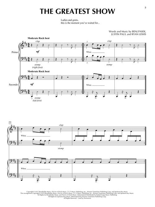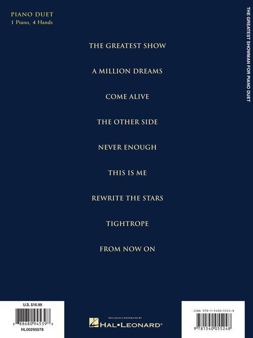 A musical drama biopic chronicling P.T. Barnum (played by Hugh Jackman) and his founding of the Barnum & Bailey Circus, this film features a stunning soundtrack by Benj Pasek and Justin Paul of La La Land and Dear Evan Hansen fame. This edition features creative piano duet arrangements for 1 piano, 4 hands. Titles: Come Alive · From Now On · The Greatest Show · A Million Dreams · Never Enough · The Other Side · Rewrite the Stars · This Is Me · Tightrope.
