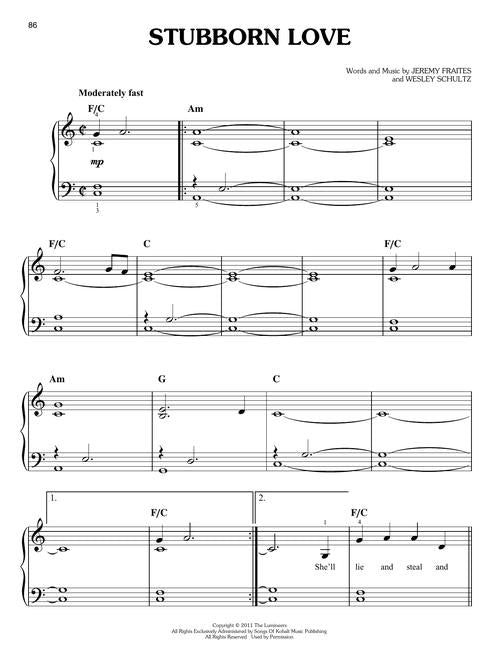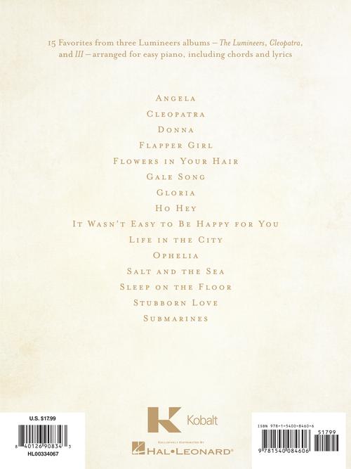 15 of the most popular songs from this Colorado-based band in accessible arrangements for easy piano, including: Cleopatra · Flapper Girl · Flowers in Your Hair · Gloria · Ho Hey · It Wasn't Easy to Be Happy for You · Ophelia · Salt and the Sea · Submarines · and more.