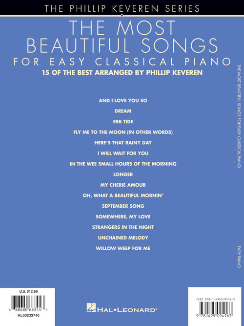 15 timeless standards expertly arranged by Phillip Keveren for easy piano that will have you humming along and tapping your toes in no time! Includes: And I Love You So · Dream · Ebb Tide · Fly Me to the Moon (In Other Words) · Here's That Rainy Day · I Will Wait for You · In the Wee Small Hours of the Morning · Longer · My Cherie Amour · Oh, What a Beautiful Mornin' · September Song · Somewhere, My Love · Strangers in the Night · Unchained Melody · Willow Weep for Me.