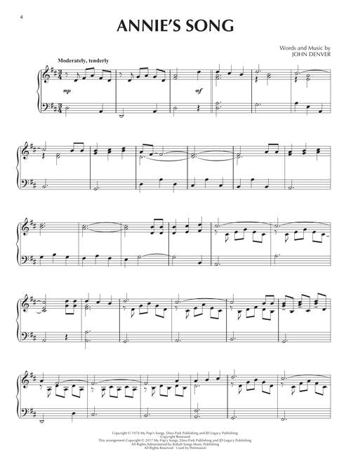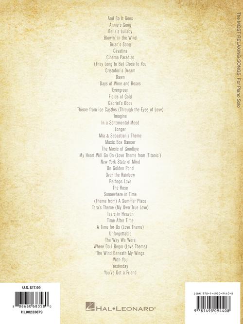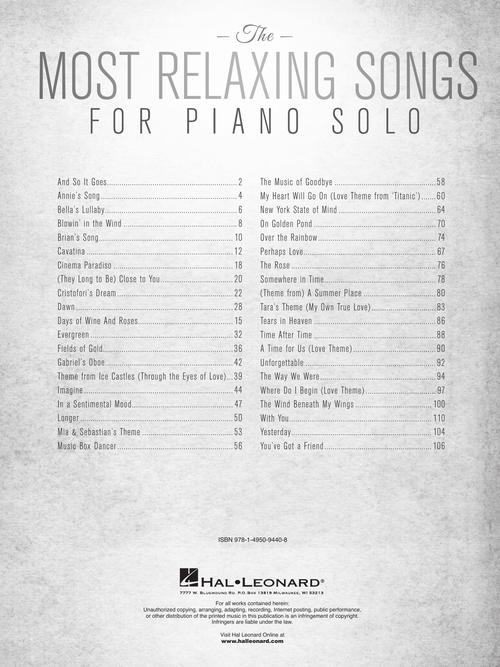40 soothing selections arranged for piano solo, including: Annie's Song · Brian's Song · Cristofori's Dream · Evergreen · Fields of Gold · Gabriel's Oboe · Imagine · Music Box Dancer · Over the Rainbow · The Rose · A Time for Us (Love Theme) · The Way We Were · You've Got a Friend · and more.