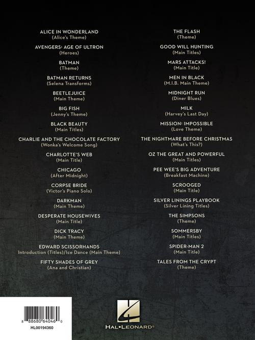 This collection features 17 piano solo arrangements of favorite Elfman movie and TV themes including: Batman Theme · Corpse Bride (Main Title from The Nightmare Before Christmas) · Desperate Housewives Main Title · Heroes (from Avengers: Age of Ultron) · M.I.B. Main Theme · Theme from the Simpsons · Spider-Man 2 (Main Title) · What's This? (from The Nightmare Before Christmas) · Wonka's Welcome Song (from Charlie and the Chocolate Factory) · and more.