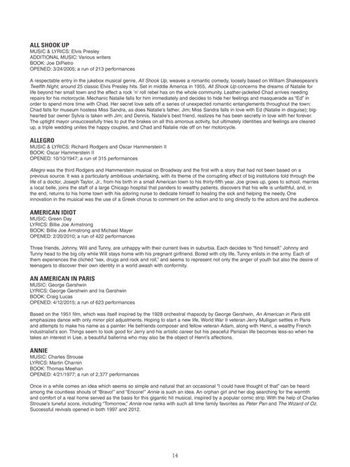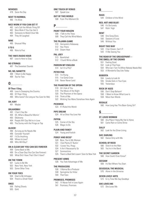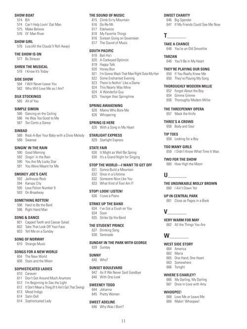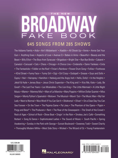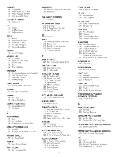 This amazing new collection features nearly 650 Broadway songs arranged with melody, lyrics and chords for C instruments. Definitely a must-own resource for any gigging or auditioning musician or actor! Includes: All I Ask of You · Always Look on the Bright Side of Life · And I Am Telling You I'm Not Going · Another Op'nin', Another Show · Any Dream Will Do · Anything Goes · Aquarius · Be Our Guest · Bess, You Is My Woman · Big Spender · Body and Soul · Brotherhood of Man · Brush up Your Shakespeare · But Not for Me · Castle on a Cloud · A Change in Me · Close Every Door · Consider Yourself · Dancing Queen · Defying Gravity · Do-Re-Mi · Don't Cry for Me Argentina · Don't Rain on My Parade · Edelweiss · Everything's Coming up Roses · Footloose · For Good · Forty-Second Street · Getting to Know You · Good Morning Baltimore · Grease · Hakuna Matata · Hello, Dolly! · Hey, Look Me Over · How Long Has This Been Going On? · I Dreamed a Dream · I Loved You Once in Silence · I Wanna Be a Producer · I'm Gonna Sit Right down and Write Myself a Letter · If I Were a Rich Man · The Impossible Dream (The Quest) · In My Life · Love Changes Everything · Mack the Knife · Mama, I'm a Big Girl Now · Mamma Mia · Memory · New York, New York · Nice Work If You Can Get It · Nine to Five · Oklahoma · On Broadway · On My Own · One · People · The Phantom of the Opera · Popular · Send in the Clowns · Seventy Six Trombones · Shall We Dance? · She Loves Me · Sit down You're Rockin' the Boat · Springtime for Hitler · Strike up the Band · Suddenly Seymour · The Surrey with the Fringe on Top · Thank Heaven for Little Girls · Tomorrow · Try to Remember · Under the Sea · Unusual Way · Walk like a Man · When I Grow Up · A Whole New World · Wishing You Were Somehow Here Again · You'll Never Walk Alone · Younger Than Springtime · and more!