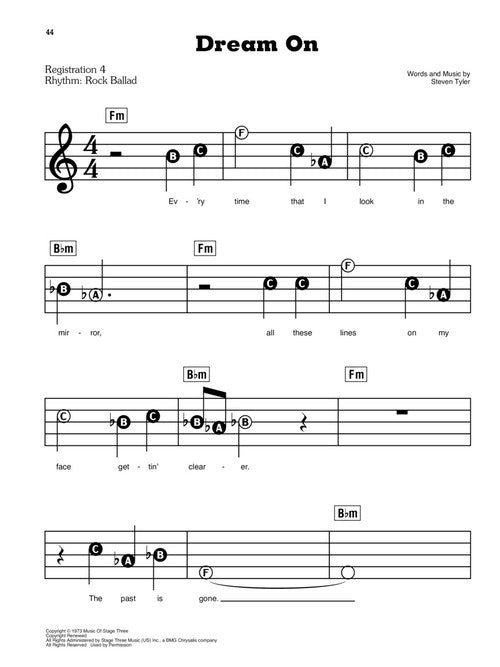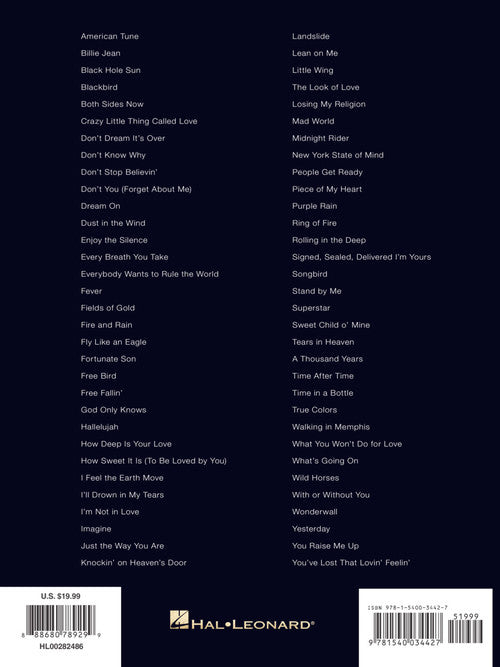 64 popular modern classics in our large print E-Z Play® Today notation with the note name in the note head. Includes: Billie Jean · Crazy Little Thing Called Love · Don't Stop Believin' · Dream On · Every Breath You Take · Free Bird · Free Fallin' · Hallelujah · Imagine · Landslide · Mad World · Purple Rain · Ring of Fire · Rolling in the Deep · Stand by Me · Tears in Heaven · With or Without You · Yesterday · and more.