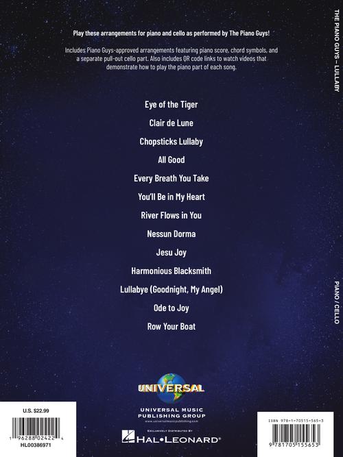 The Piano Guys have taken classical tunes, originals, and pop hits, and rearranged them into soft lullabies perfect for relaxing works-perfect for helping yourself of your audience (hopefully snug inside your house!) fall to sleep! 10 songs, including: Chopsticks Lullaby · Clair De Lune · Every Breath You Take · Jesu Joy · Lullabye (Goodnight, My Angel) · Ode to Joy · and more. This deluxe songbook features color photos of The Piano Guys as well as a pull-out with the cello parts.