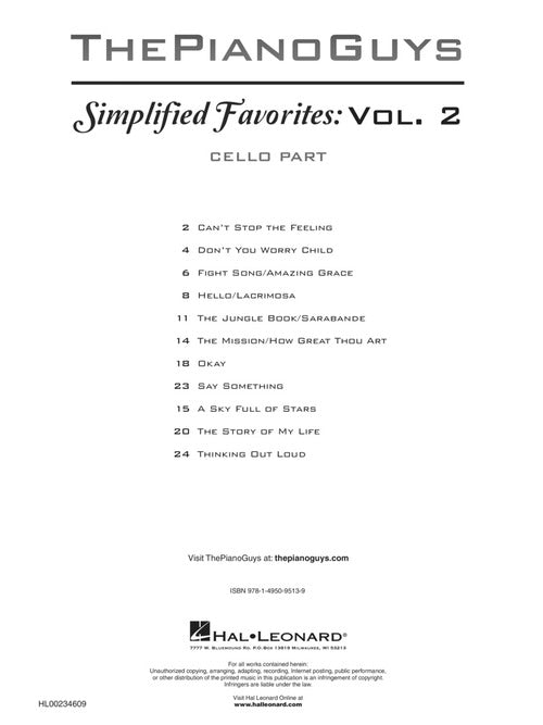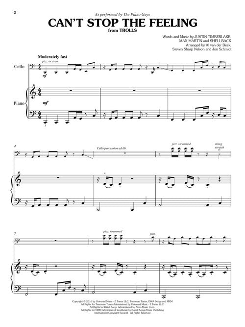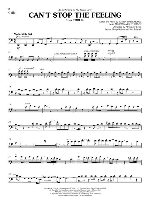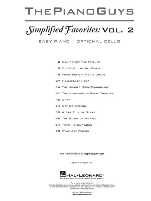 Play 12 favorites as performed by the Piano Guys, arranged for easy piano and cello with a separate pull-out cello part included. Songs include: Can't Stop the Feeling · Don't You Worry Child · Fight Song/Amazing Grace · Hello/Lacrimosa · The Jungle Book/Sarabande · The Mission/How Great Thou Art · Okay · Say Something · A Sky Full of Stars · Story of My Life · Thinking Out Loud · What Are Words.