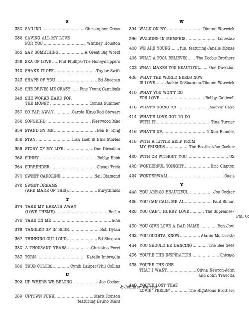 Almost 200 additional pop mainstays of modern repertoire laid out in the favored Real Book style. Songs include: Africa · All About That Bass · Beast of Burden · Blackbird · Change the World · Crazy Little Thing Called Love · Dancing Queen · Despacito · Endless Love · Faith · Free Fallin' · Girls Just Want to Have Fun · Hello · Hit the Road Jack · I Wanna Dance with Somebody · I Will Survive · Jack and Diane · Last Kiss · Lean on Me · Man in the Mirror · Moves like Jagger · No Rain · Oye Como Va · Poker Face · Rehab · Royals · Stand by Me · Sweet Caroline · Take on Me · True Colors · Uptown Funk · What's Love Got to Do with It · With or Without You · You Are So Beautiful · You Can't Hurry Love · and more.