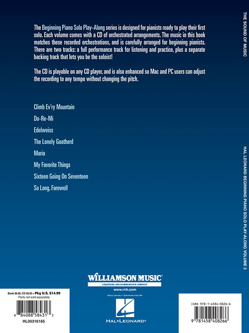 The Beginning Piano Solo Play-Along series is designed for pianists ready to play their first solo. Each volume comes with a CD of orchestrated arrangements. The music in this book matches these recorded orchestrations, and is carefully arranged for beginning pianists. There are two tracks: a full performance track for listening and practice, plus a separate backing track which lets you be the soloist! The CD is playable on any CD player, and is also enhanced so Mac and PC users can adjust the recording to any tempo without changing the pitch. This volume features 8 songs from the beloved Rodgers & Hammerstein masterpiece: Climb Ev'ry Mountain · Do-Re-Mi · Edelweiss · The Lonely Goatherd · Maria · My Favorite Things · Sixteen Going on Seventeen · So Long, Farewell.