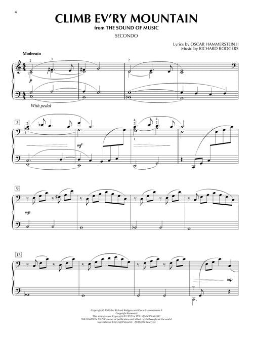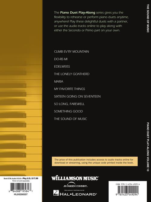 10 songs from the classic musical, including: Climb Ev'ry Mountain · Do-Re-Mi · Edelweiss · The Lonely Goatherd · Maria · My Favorite Things · Sixteen Going on Seventeen · So Long, Farewell · Something Good · The Sound of Music. Includes access to online audio files for when a partner is unavailable. The price of this book includes a unique code that provides access to audio tracks online, for download or streaming. The tracks include PLAYBACK+, a multi-functional audio player that allows you to slow down audio without changing pitch, set loop points, change keys, and pan left or right - available exclusively from Hal Leonard.