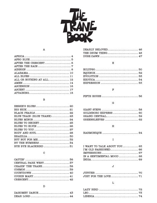 This collection pays tribute to one of the most influential players in jazz history with over 125 of Coltrane's most memorable works, including: Afro Blue · Alabama · Blue Train (Blue Trane) · Body and Soul · Bye Bye Blackbird · Crescent · Giant Steps · I Want to Talk About You · Jupiter · Lush Life · My Favorite Things · Oleo · So What · Summertime · and more.