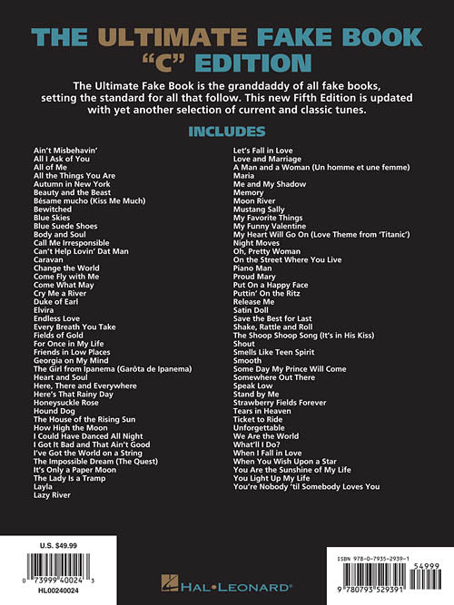 This fake book is a cornerstone for many musicians' libraries. With over 1200 songs in all styles of music, this fifth edition has been updated to include even more great songs and recent hits. From jazz standards to Broadway blockbusters and country classics to pop chart-toppers, this book has the songs you're looking for all in one convenient collection. It is comb-bound with locked tabs to ensure long-lasting durability. Songs include: All the Things You Are · Blue Skies · Body and Soul · Come Fly With Me · Endless Love · The Girl from Ipanema (Garota de Ipanema) · The House of the Rising Sun · Love and Marriage · Memory · Moon River · Mustang Sally · Night Moves · Over the Rainbow · Piano Man · Satin Doll · Shout · Smooth · Start Me Up · Strawberry Fields Forever · Tears in Heaven · Unforgettable · hundreds more!