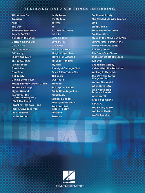 This amazing collection features nearly 550 rock and pop hits essential for any musician's library! Songs include: Against the Wind · American Pie · American Woman · Bad Day · Bohemian Rhapsody · Born to Be Wild · Clocks · Dancing with Myself · Detroit City · Eye of the Tiger · Hurt So Bad · Proud Mary · Rocket Man (I Think It's Gonna Be a Long Long Time) · Should I Stay or Should I Go · Total Eclipse of the Heart · Unchained Melody · Waterloo · We've Got Tonight · When Doves Cry · Will You Love Me Tomorrow (Will You Still Love Me Tomorrow) · Yellow Submarine · Y.M.C.A. · You Raise Me Up · and more.
