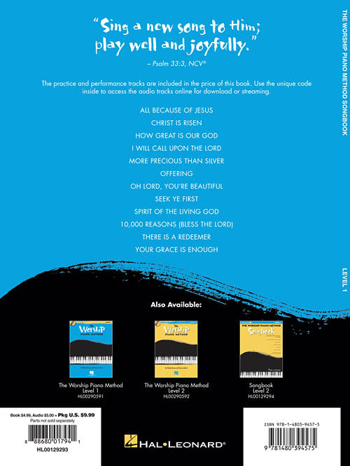 The Worship Piano Method Songbook - Level 1 Softcover Audio Online The Worship Piano Method is designed for beginning piano students who desire to praise God through His gift of music. Using solid pedagogy, appealing songs and fun activities, this course provides a strong foundation to develop both piano skills and a lifestyle of worship. This songbook corresponding to Book 1 features a dozen songs with access to practice and performance audio tracks you can download online. Songs include: All Because of Jesus · Christ Is Risen · How Great Is Our God · I Will Call upon the Lord · More Precious Than Silver · Offering · Oh Lord, You're Beautiful · Seek Ye First · Spirit of the Living God · 10,000 Reasons (Bless the Lord) · There Is a Redeemer · Your Grace Is Enough. Online audio is accessed at halleonard.com/mylibrary (http://www.halleonard.com/mylibrary) Inventory # : 00129293 UPC: 888680017941 ISBN: 1480394572 Width: 9" Length: 12" Height: 0.077" Product Weight: 0.2 lbs. Number of Pages: 16