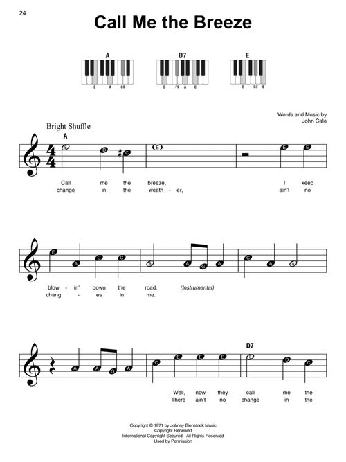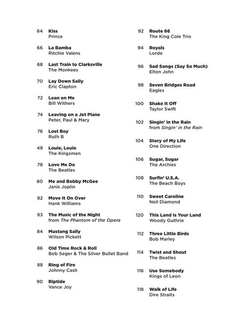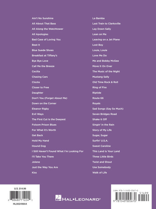 It's super easy! This series features accessible arrangements for piano, with simple right-hand melody, letter names inside each note, basic left-hand chord diagrams, and no page turns. This edition includes 60 songs from a variety of genres: All About That Bass · Beat It · Clocks · Daughter · Evil Ways · Folsom Prison Blues · Hound Dog · I Still Haven't Found What I'm Looking For · Jolene · Kiss · La Bamba · The Music of the Night · Old Time Rock & Roll · Riptide · Sweet Caroline · Twist and Shout · Use Somebody · Walk of Life · and more.