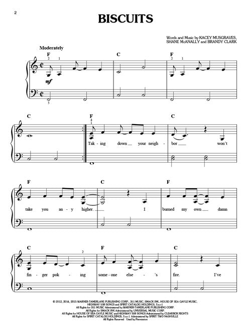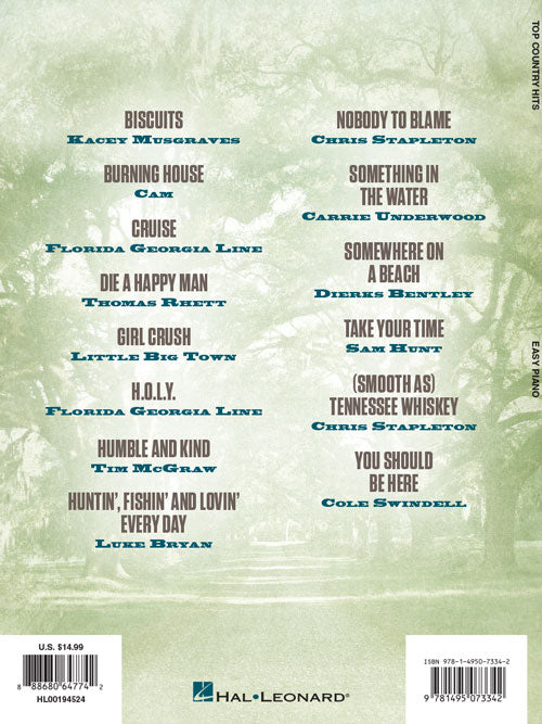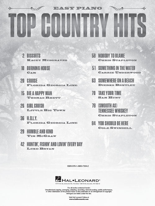 14 of the most popular contemporary country hits in simplified arrangements for piano. Includes: Biscuits · Burning House · Cruise · Die a Happy Man · Girl Crush · H.O.L.Y. · Humble and Kind · Huntin', Fishin' and Lovin' Every Day · Nobody to Blame · Something in the Water · Somewhere on a Beach · Take Your Time · (Smooth As) Tennessee Whiskey · You Should Be Here.