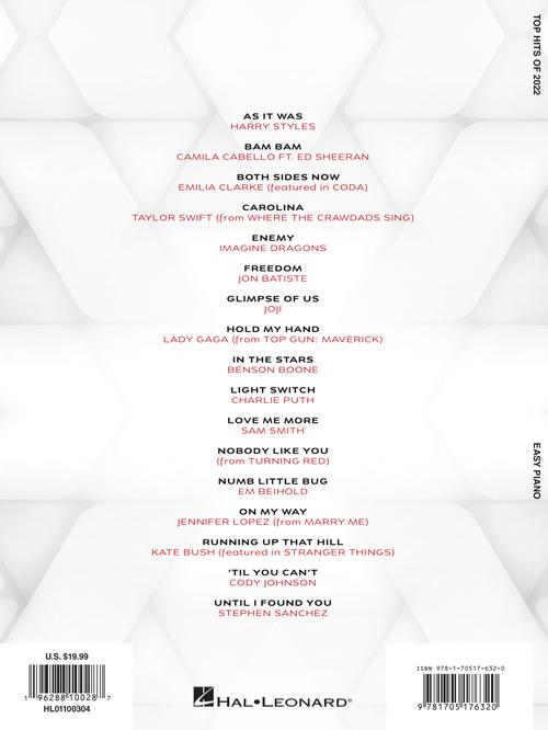 This songbook features seventeen of the year's best songs by the hottest artists arranged for easy piano with lyrics. Songs include: As It Was (Harry Styles) · Bam Bam (Camila Cabello ft. Ed Sheeran) · Carolina (Taylor Swift) · Enemy (Imagine Dragons) · Freedom (Jon Batiste) · Numb Little Bug (Em Beihold) · On My Way (Jennifer Lopez) · Running up That Hill (Kate Bush) · and more.