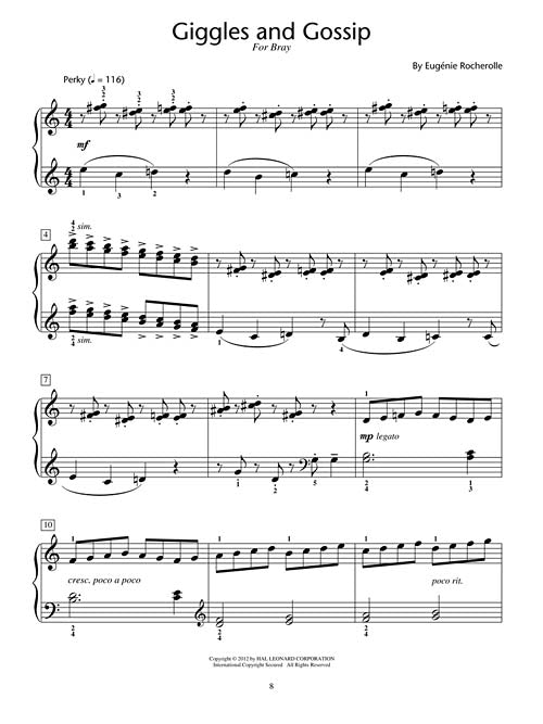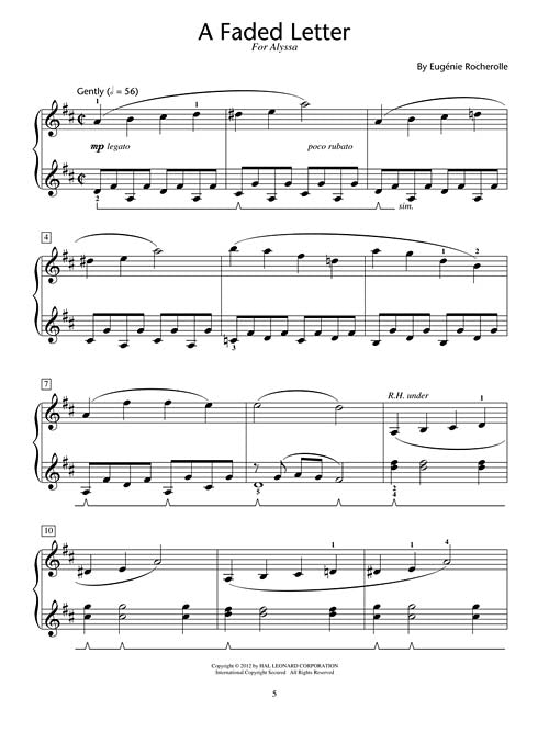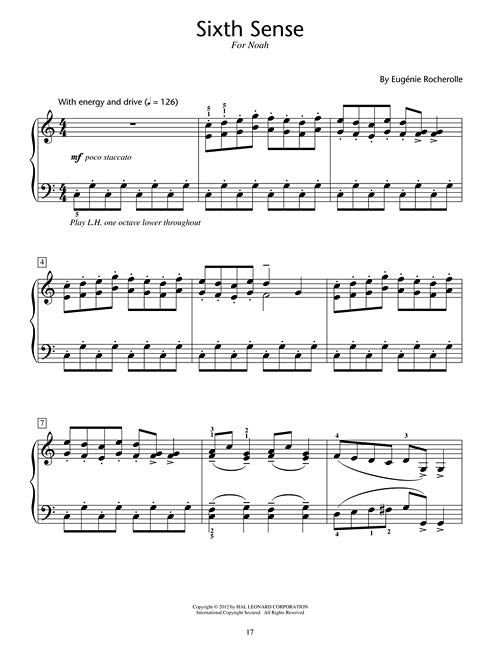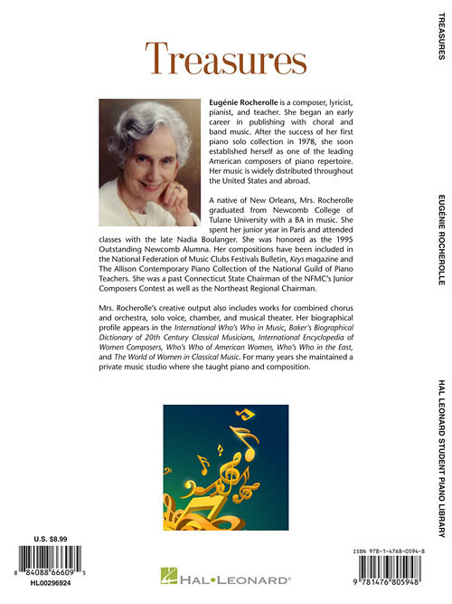 Treasures HLSPL Composer Showcase NFMC 2014-2016 Selection Late Elementary/Early Intermediate Publisher: Hal Leonard Category: Educational Keyboard Series: Educational Piano Library Format: Softcover Eugénie Rocherolle created seven character pieces to represent each of her grandchildren. From heartfelt tenderness to rambunctious humour, each piece is truly a treasure. Written for the late-elementary/early-intermediate level, students will enjoy playing in a variety of moods and keyboard styles. Includes: Chatterbox · A Faded Letter · Giggles and Gossip · Pavane · Prairie Song · Saddle Up! · Sixth Sense. To see other NFMC selections, click here (http://www.halleonard.com/promo/promo.do?promotion=183) . Inventory # : 00296924 UPC: 884088666095 ISBN: 1476805946 Width: 9" Length: 12" Height: 0.098" Product Weight: 0.3 lbs. Number of Pages: 24
