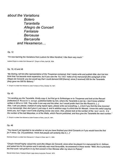 Various Works for Piano, Series A Chopin National Edition 12A, Volume XII Softcover Includes these pieces published during the composer's lifetime: Allegro de Concert; Barcarolle; Berceuse; Bolero; Fantaisie, Op. 49; Tarantella; Variations brillantes, Op. 12; Variations VI from Hexameron. The National Edition of the Works of Fryderyk Chopin Published by PWM Exclusively Distributed by Hal Leonard Corporation Co-Editors Jan Ekier and Pawel Kaminski The objective of the National Edition is to present Chopin's complete output in its authentic form, based on the entire body of available sources. Sources were analyzed with up-to-date scientific and musicological methodology. The National Edition was based on sources originated from the composer, mainly autographs, copies of autographs and first editions with the composer's corrections, and pupils' copies with Chopin's annotations. In cases when original sources were lacking, the closest possible materials were used. Collecting the source materials was a laborious task which took years of effort. The characteristics of sources, the links and discrepancies between them as well as the reasons for particular editorial decisions are discussed in the Source Commentary in each volume. The Performance Commentary appended to each volume includes: the realization of ornaments, comments on pedal markings (the original markings sometimes are inadequate, due to the difference in sound between pianos used in Chopin`s times and modern pianos), suggestions as to the harmonic legato (a performance technique often used by Chopin and now forgotten). About the National Edition (http://serwer1374796.home.pl/wp-content/uploads/2013/05/o_wydaniu_narodowym.pdftarget=_blank) Full Introduction to the Polish National Edition of the Works of Fryderyk Chopin (http://serwer1374796.home.pl/wp-content/uploads/2013/05/introduction_to_NE.pdftarget=_blank) Inventory # : 00132353 UPC: 884088971878 ISBN: 8389003856 Width: 9.25" Length: 12" Height: 0.3" Product Weight: 1 lbs. Number of Pages: 128