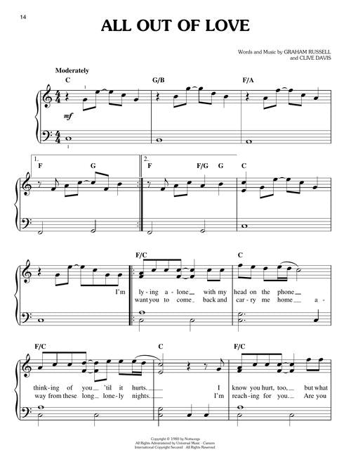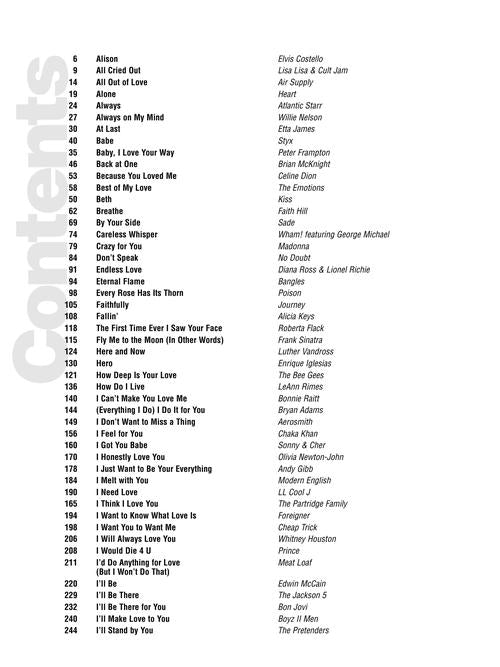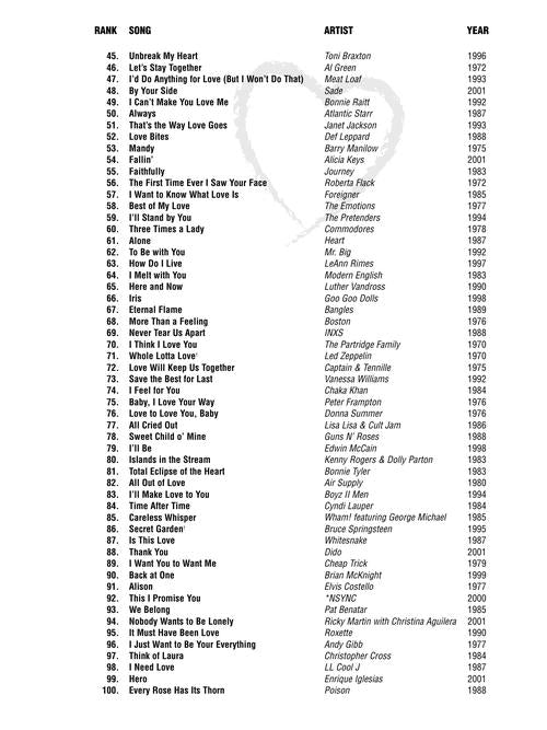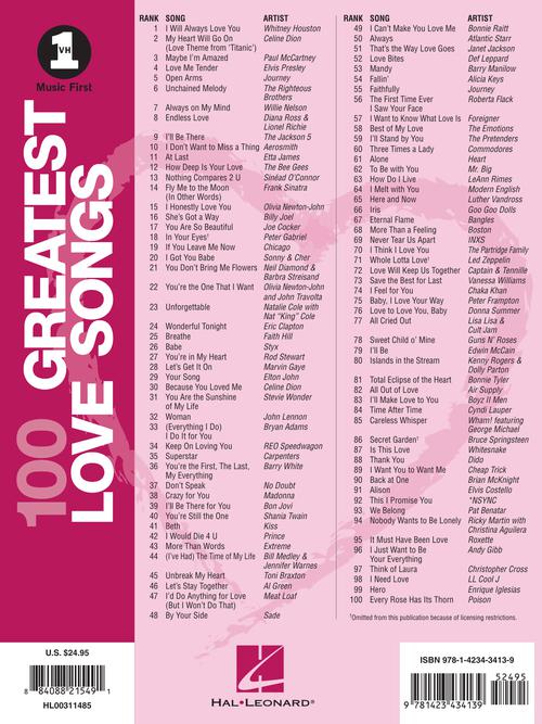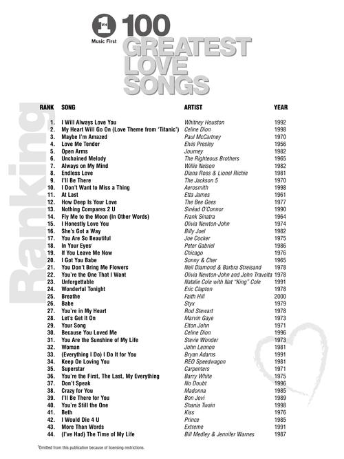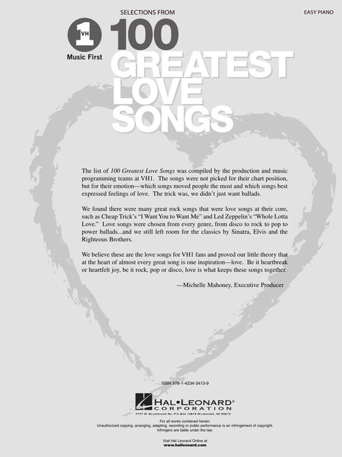 The very best love songs from all genres chosen by VH1 and ranked 1-100. Includes easy arrangements of: I Will Always Love You · My Heart Will Go On · Maybe I'm Amazed · Love Me Tender · Open Arms · Unchained Melody · and dozens more, plus info on the selection process. 480 pages of great music!