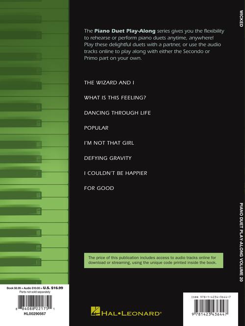 The great Wicked songs arranged as piano duets! The book also comes with access to online audio that features separate tracks for the Primo and Secondo parts - perfect for practice and performance! 8 selections from the hit musical, including: Dancing Through Life · Defying Gravity · For Good · I Couldn't Be Happier · I'm Not That Girl · Popular · What Is This Feeling? · The Wizard and I. Audio is accessed online using the unique code inside the book and can be streamed or downloaded. The audio files include PLAYBACK+, a multi-functional audio player that allows you to slow down audio without changing pitch, set loop points, change keys, and pan left or right.