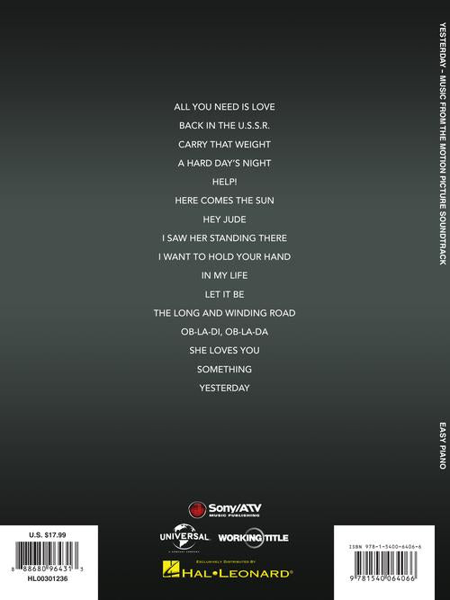 This summer 2019 film answers the question What if no one remembered the Beatles ... but you? Our matching folio to the movie soundtrack features 16 Fab Four classics: All You Need Is Love · Back in the U.S.S.R. · Carry That Weight · A Hard Day's Night · Help! · Here Comes the Sun · Hey Jude · I Saw Her Standing There · I Want to Hold Your Hand · In My Life · Let It Be · The Long and Winding Road · Ob-La-Di, Ob-La-Da · She Loves You · Something · Yesterday.