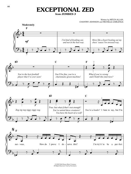 Now you can play your favorite songs from all three Zombie movies with this new collection featuring 12 songs arranged for easy piano with lyrics. It even includes color scenes from the movies. Songs include: Ain't No Doubt About It · Exceptional Zed · Fired Up · Flesh & Bone · I'm Finally Me · Like the Zombies Do · Nothing but Love · Our Year · Someday · Stand · We Got This · We Own the Night.