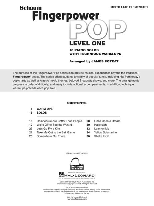 Arranger: James Poteat Fingerpower Pop - Level 1 10 Piano Solos with Technique Warm-Ups Publisher: Schaum Publications Category: Educational Keyboard Series: Educational Piano Format: Softcover 10 great pop piano solo arrangements with fun technical warm-ups that...Regular price $13.99 -