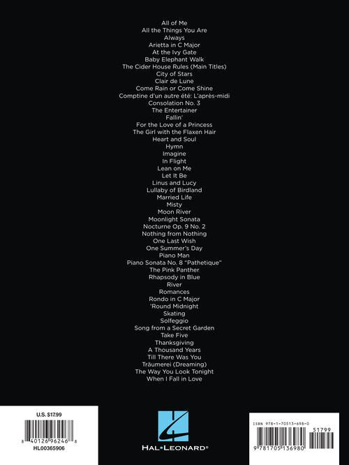 First 50 Piano Solos You Should Play Publisher: Hal Leonard Category: Keyboard & Piano/Vocal/Guitar Series: Easy Piano Songbook Format: Softcover This collection features 50 simply arranged, must-know classical and contemporary favorites, including: Always · Clair de...Regular price $23.99 -
