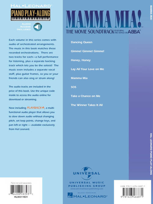 Mamma Mia! - The Movie Piano Play-Along Volume 73 Publisher: Hal Leonard Category: Keyboard & Piano/Vocal/Guitar Series: Piano Play-Along Format: Softcover Audio Online 8 songs from the smash movie musical featuring the hits of ABBA with...Regular price $23.99 -