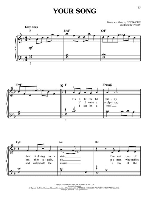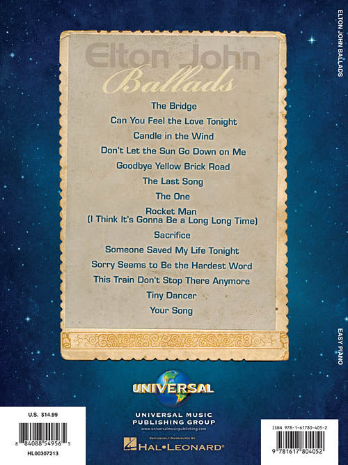 Elton John Ballads Publisher: Hal Leonard Category: Keyboard & Piano/Vocal/Guitar Series: Easy Piano Personality Format: Softcover 14 of Elton's most popular ballads, including: Can You Feel the Love Tonight · Candle in the Wind · Don't...Regular price $27.99 -