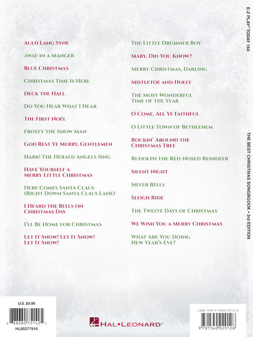 The Best Christmas Songbook - 3rd Edition E-Z Play Today Volume 164 Publisher: Hal Leonard Category: Keyboard & Piano/Vocal/Guitar Series: E-Z Play Today Format: Softcover This third edition features 30 all-time Christmas favorites, including: Away in...Regular price $13.99