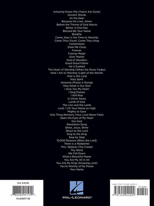 First 50 Worship Songs You Should Play on Piano Publisher: Hal Leonard Category: Keyboard & Piano/Vocal/Guitar Series: Easy Piano Songbook Format: Softcover 50 worship favorites for beginning pianists to learn, including: Amazing Grace (My Chains Are...Regular price $26.99 -