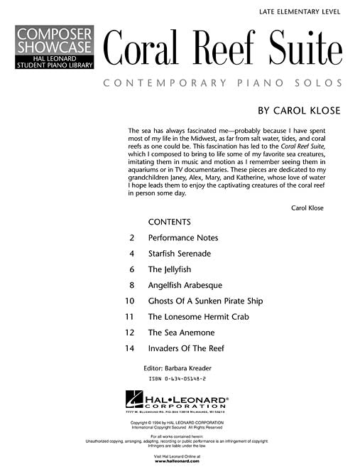 Coral Reef Suite Late Elementary Level Composer Showcase Publisher: Hal Leonard Category: Educational Keyboard Series: Educational Piano Library Format: Paperback This masterful collection of mildly contemporary solos for young students explores clusters, pedal effects, and whole-tone...Regular price $10.99 -