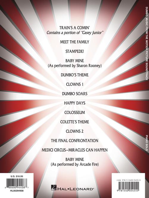 Dumbo Music from the Motion Picture Soundtrack Publisher: Hal Leonard Category: Keyboard & Piano/Vocal/Guitar Series: Piano Solo Songbook Format: Softcover This folio features 13 pieces from Danny Elfman's acclaimed score for the live action 2019 adaptation...Regular price $20.99 -