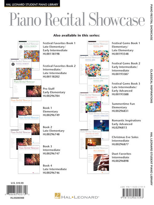 Piano Recital Showcase - Classical Inspirations Hal Leonard Student Piano Library Late Elementary-Intermediate Le Publisher: Hal Leonard Category: Educational Keyboard Series: Educational Piano Library Format: Softcover This collection, presented in order of difficulty, brings 10 playable...Regular price $13.99 -