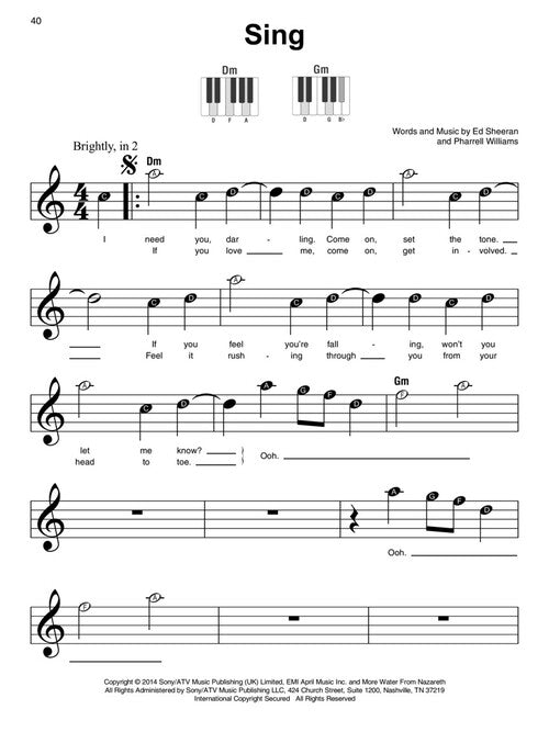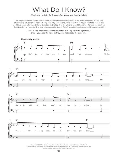 Ed Sheeran - Really Easy Piano Publisher: Hal Leonard Category: Keyboard & Piano/Vocal/Guitar Series: Really Easy Piano Format: Softcover 40 of Sheeran's best, specially arranged for really easy piano with chords and lyrics. Each song includes...Regular price $31.99 -