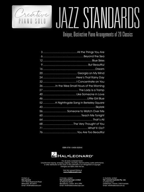 Jazz Standards - Creative Piano Solo Publisher: Hal Leonard Category: Keyboard & Piano/Vocal/Guitar Series: Piano Solo Songbook Format: Softcover Looking to add some variety to your playing? Check out the Creative Piano Solos series that provides...Regular price $17.99