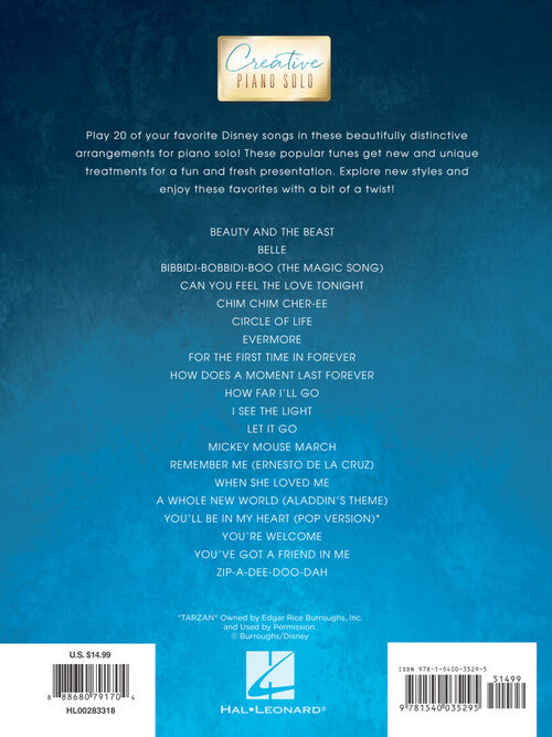 Disney Favorites - Creative Piano Solo Publisher: Hal Leonard Category: Keyboard & Piano/Vocal/Guitar Series: Piano Solo Songbook Format: Softcover 20 Disney favorites creatively reimagined into fresh arrangements for the intermediate to advanced player. Includes: Belle ยท...Regular price $20.99 -
