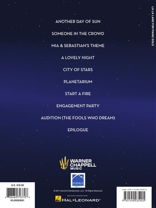 La La Land for Piano Solo Intermediate Level Publisher: Hal Leonard Category: Keyboard & Piano/Vocal/Guitar Series: Piano Solo Songbook Format: Softcover Ten songs from the popular soundtrack to this 2016 Academy Award-winning film, arranged for piano...Regular price $21.99 -