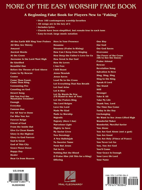 More of the Easy Worship Fake Book Over 100 Songs in the Key of C Publisher: Hal Leonard Category: Keyboard & Piano/Vocal/Guitar Series: Easy Fake Book Format: Softcover By popular request, here's a second volume featuring...Regular price $32.99
