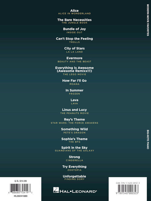 Composer: Various Modern Movie Favorites Publisher: Hal Leonard Category: Keyboard & Piano/Vocal/Guitar Series: Big Note Songbook Format: Softcover Beginning pianists will love to play the 18 familiar movie hits in this collection, including: Alice · The...Regular price $17.99 -